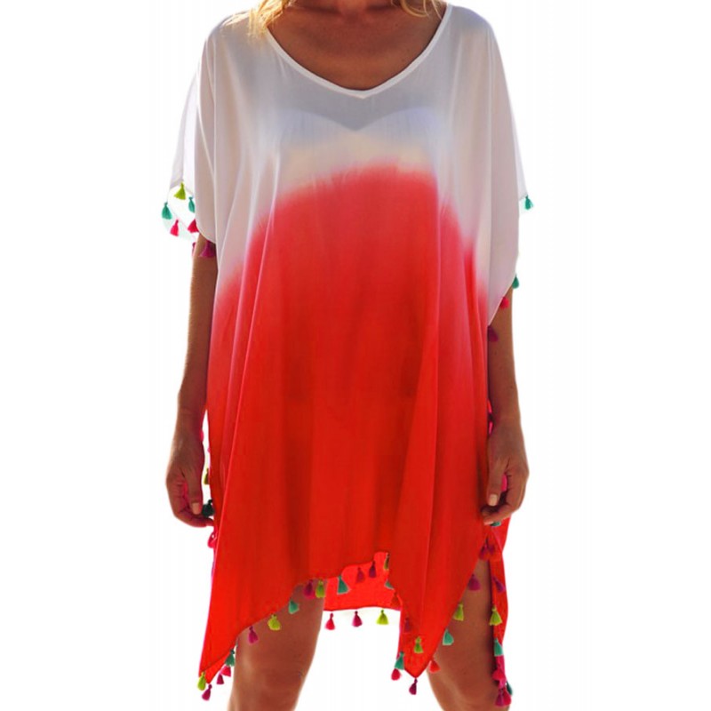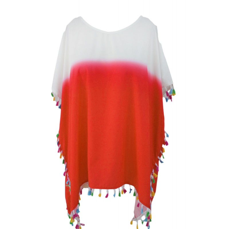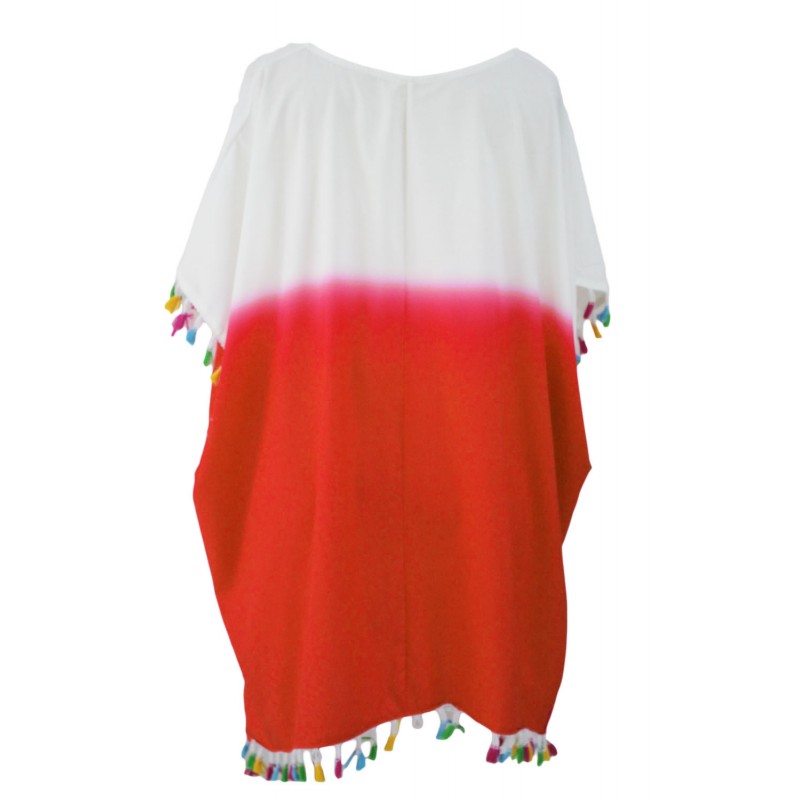 Καλοκαιρινό καφτάνι σε χρώμα άσπρο-πορτοκαλί. Στο τελείωμα έχει μικρές πολύχρωμες φουντίτσες. Το μήκος του φτάνει ως τους μηρούς. Τα μανίκια είναι αρκετά αέρινα και φτάνουν σχεδόν ως τους αγκώνες. Τα υλικά κατασκευής είναι polyester kai spandex.